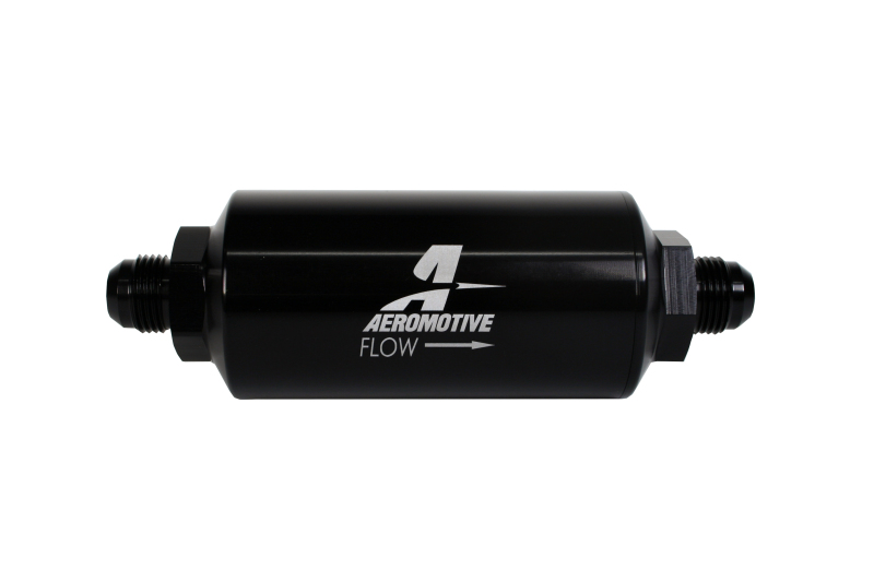 AN-08, 100 micron stainless steel element, black anodize finish An inexpensive insurance policy to protect your investment, proper filtration is key to fuel system performance. Engineered filter solutions are required to achieve protection with minimum restriction. For 200 ? 3,000 plus HP applications, our filter assemblies offer unmatched flow, ease of installation and maintenance, along with the impeccable machining and finish you?ve come to expect from all Aeromotive components. High-flow, 100-micron Stainless steel?replaceable element. Flows 2,000 lb/hr with a pressure drop of less than 1 PSI. Males AN-08. All filter assemblies feature an O-ring for positive sealing in high pressure applications. CNC-machined from 6061-T6 aircraft aluminum. Bright dip black anodized finish for a corrosion resistant, show car quality appearance.