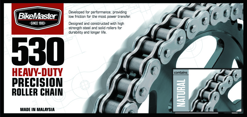 Developed for performance, providing low friction for the most power transfer. Designed and constructed with high-strength steel and solid rollers for durability and longer life. Note: This chain must be correctly matched to the machine size and power output. Failure to do so could result in chain failure, causing machine or property damage, serious injury or death. It is the responsibility of the installer to ensure that the chain selected is correctly matched to the machine and installed correctly. If you have any doubts, contact a professional before use.