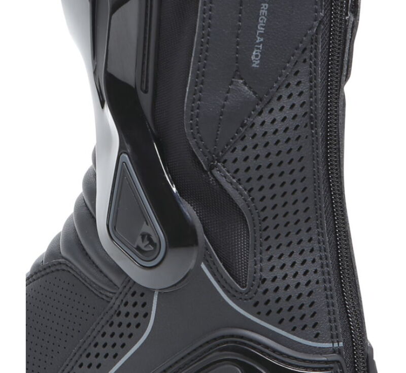 The Dainese Nexus 2 Air sport motorcycle boots with certified protectors are made of microfiber and D-Stone, with a perforated upper section to allow for air flow and optimal ventilation in case of warmer temperatures. Equipped with a nylon insert at the heel, replaceable thermoplastic sliders and the Axial Distortion Control ankle joint bending System guarantee high levels of protection, maximum comfort, and lightness.