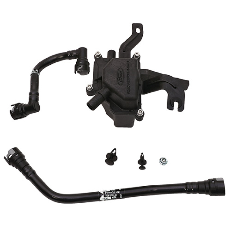 Ford Performance Parts Oil- Air Separator is precision molded canister with unique filter media separates oil vapor from the air in the PCV system. Designed and engineered specifically for installation on the Ford 5.0L Coyote Engine. All OEM hoses and fittings are used for a high quality installation and function. This is a highly engineered system, not a universal 'fits-all' kit.