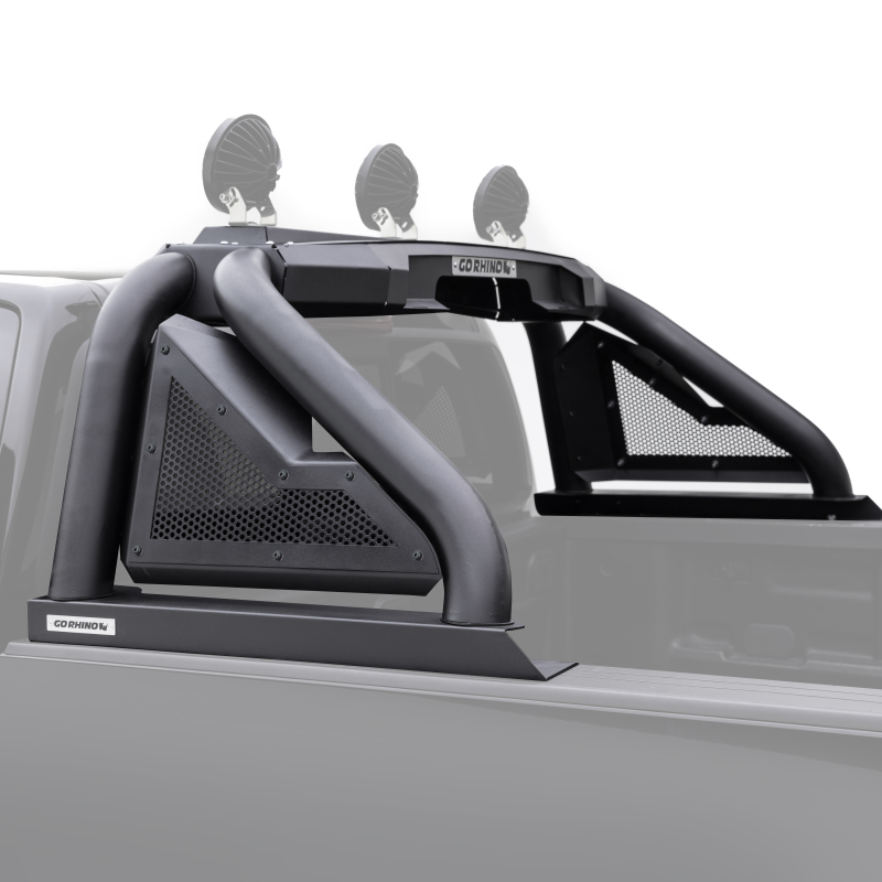 Go Rhino’s Sport Bar 2.0 can be installed on a full-sized and mid-sized truck bed along with your favorite snap, roll up and some folding tonneau covers. Now it’s no longer necessary to choose between a bed cover or adding functional lighting when making a dramatic appearance upgrade. The Sport Bar 2.0 offers two LED mounting options: the STANDARD FIXED MOUNT and the patented POWER-ACTUATED HIDEAWAY MOUNT. The standard version will raise your lights or LED light bar above your truck’s cab. The Power Actuated light mount is available pre-installed on the Sport Bar 2.0 or as a separate upgrade. This powered mount will allow you to, at the flick of a switch from inside the vehicle, hide your lights in a protective light box without leaving your vehicle. This ability to retract your lights will be especially appreciated the next time you pull into a garage in inclement weather. (All lights sold separately). The Sport Bar 2.0 comes with a Limited Lifetime warranty on materials and construction and a 5 year warranty on the Textured Black Finish.