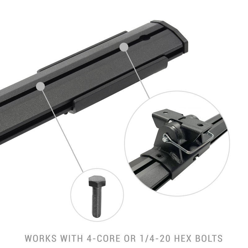 Go Rhino’s XRS Cross Bars allow you to mount a rooftop tent on your truck while preserving the utility and capacity of your factory truck bed. The corner uprights elevate and support the 4-CORE cross bars approximately six inches above the factory bed cap, which provides for unobstructed access to the truck bed. Mounted tents and cargo boxes will sit below the roof of the cab, which reduce wind resistance. Each 4-CORE cross bar works with standard ¼-20 hex head bolts which allows unlimited mounting options for gear, trail tools and all your toys. Installation is easy with no drilling however cutting is required on midsize trucks. XRS Cross Bars come with a Limited Lifetime warranty on materials and construction and a 5 year warranty on the Textured Black Finish.