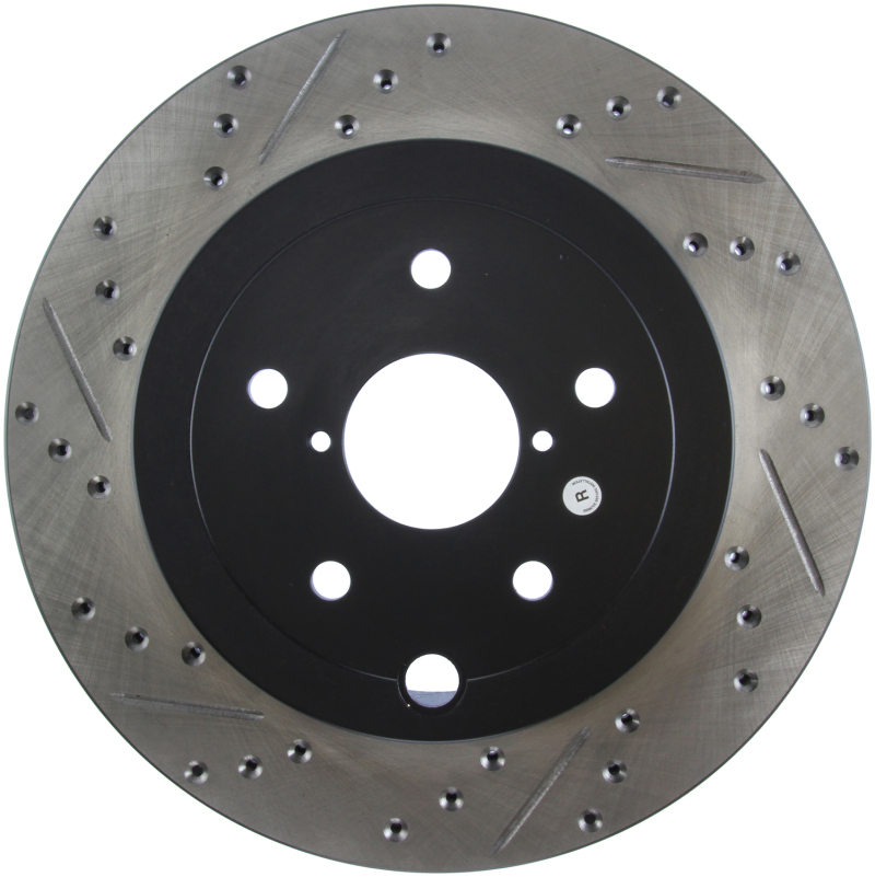 StopTech Drilled and Slotted Sport Rotors are 1-piece direct replacement brake discs for factory brake systems and stock calipers that look great behind your wheels – and offer significantly improved braking performance. The unique cross-drilling and slotting aids with heat and brake dust dispersal; prevents glazing of the pads; adds bite and improves wet and dry braking performance. Built to last; the black e-coating provides protection from corrosion and the high carbon metallurgy (in most applications) offers quieter operation; better crack resistance and increased performance.